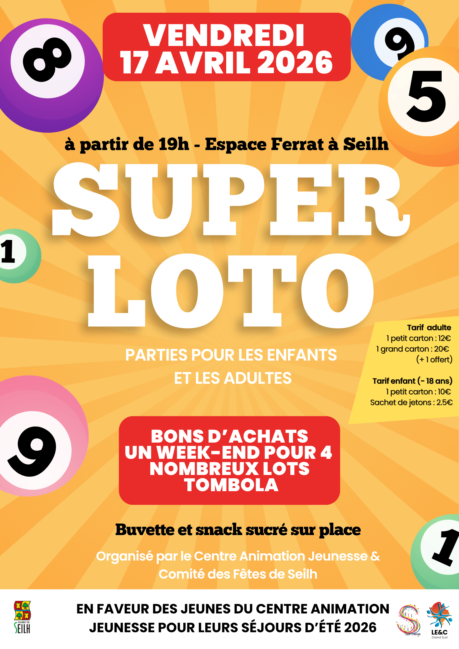 Dans le cadre des actions menées pour les jeunes de la commune, nous organisons un loto à Seilh, en collaboration avec le Comité des Fêtes de Seilh, le vendredi 17 avril prochain, de 19h à 22h30, à l’Espace Ferrat.